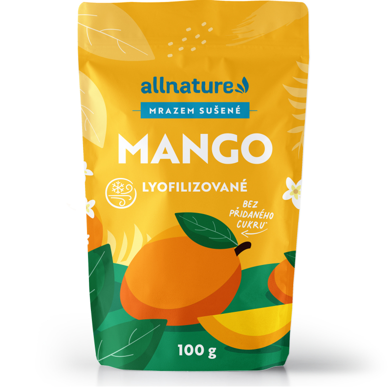 Mango sušené mrazem, neboli lyofilizované mango Allnature si díky šetrnému procesu lyofilizace zachovává barvu, chuť, vůni a živiny jako čerstvé mango. Proces lyofilizace spočívá v prudkém zmrazení a následném pomalém sušení ve vakuu, které mango zbaví 95 % vody. Lyofilizované mango Allnature nejsou dodatečně doslazovány. Ideální do jogurtů, musli, kaší, nejrůznějších dezertů nebo i jen tak samotné. Při správném skladování má lyofilizované mango velmi dlouhou trvanlivost.