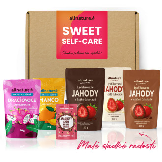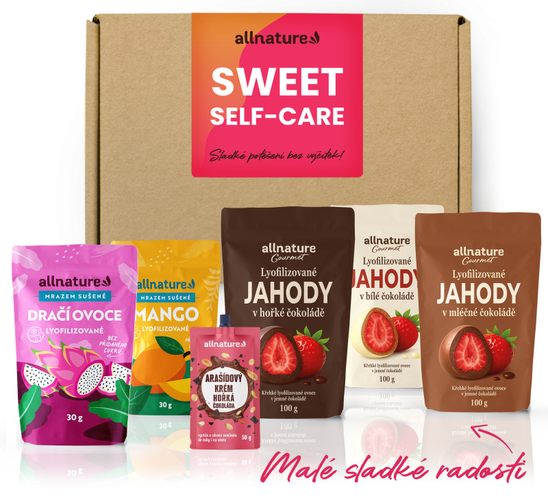 Dopřej si chvíli jen pro sebe s balíčkem, který kombinuje sladké požitky, přírodní ovoce a zdravé dobroty. Allnature Sweet Self-Care je stvořen pro všechny, kteří chtějí spojit malé radosti s péčí o tělo – od antioxidantů v mrazem sušeném ovoci po lahodný arašídový krém s čokoládou.
