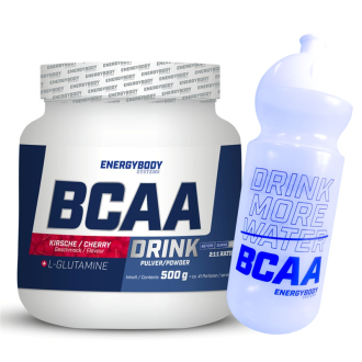 Složení příchuť třešeň: BCAA instantní směs (L-leucin 28,6%, L-isoleucin 14,3%, L-valin 14,3%), emulgátor sojový lecitin, L-glutamin 20,8%, maltodextrin, aroma, regulátor kyselosti kyselina citronová, sladidlo acesulfam K, sladidlo sukralóza, barvivo červená řepa extrakt, vitamín B6.