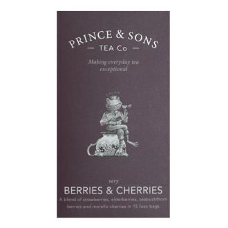 Prince & Sons Berries & Cherries je ovocná exploze vyvážených chutí červených jahod, voňavých bezinek, jablek, ananasu a šťavnatých třešní. To vše je doplněno rakytníkem, který je bohatý na vitamín C, a vyladěno květy modré chrpy, ibišku a okvětních lístků růží. Jedno balení obsahuje 15 čajových sáčků fuso.