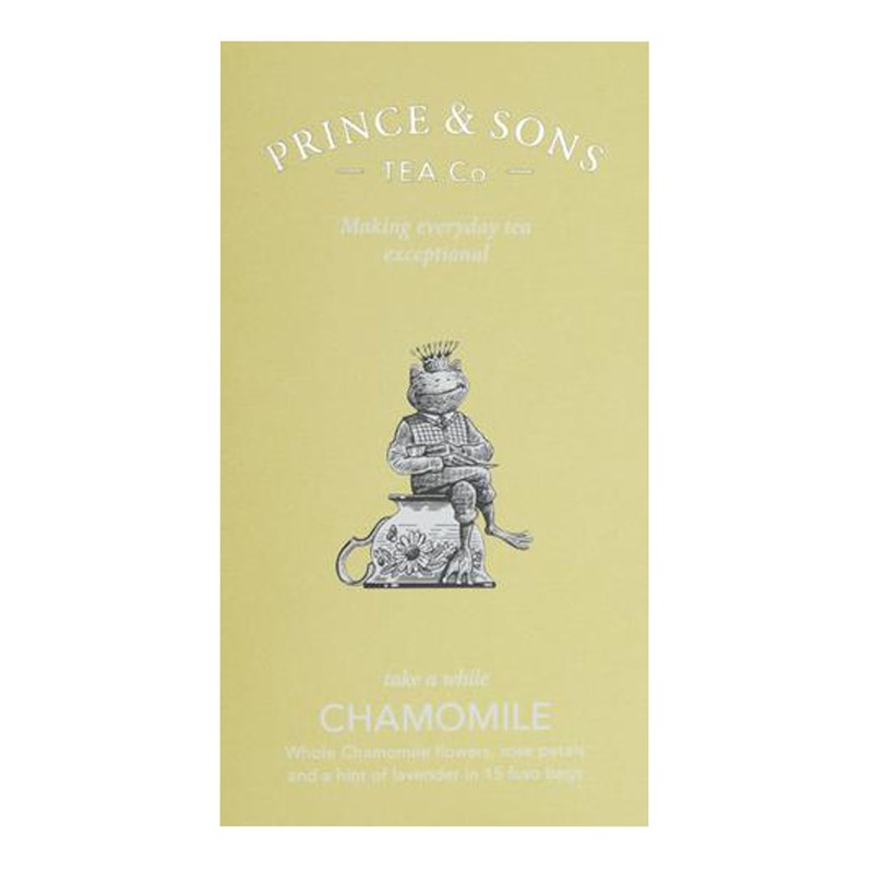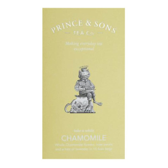 Heřmánek, známý svým uklidňujícím účinkem, je dokonalým partnerem, když se potřebujete uvolnit. Při snaze o nejlepší chuť používá Prince & Sons jen celé květy heřmánku. Další součástí jsou květy luxusních růží a rozptyl uklidňující levandule. Tento heřmánkový čaj je nebeská květinová směs, vyrobená pro rozpuštění a vymizení všech starostí. Jedno balení obsahuje 15 čajových sáčků fuso.