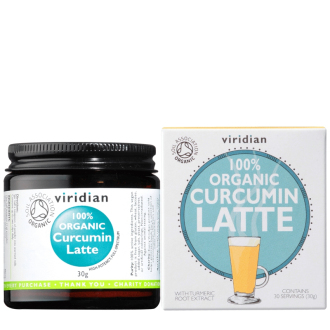 100% BIO Viridian Curcumin Latte obsahuje kromě pečlivě namíchaných kořenících přísad (zázvor, vanilka, kardamom a chilli) speciální extrakt z kurkumy, který má mnohonásobně vyšší obsah účinné látky kurkuminu. Latte lze pít na snídani nebo kdykoli během dne na svačinu.