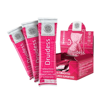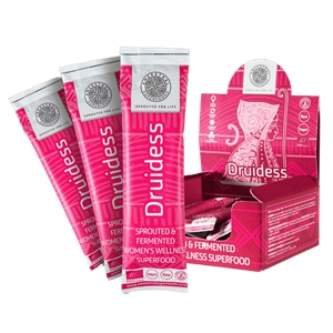 Unikátní receptura Druidess obsahuje 100% stravitelných vitamínů, minerálů, vlákniny, enzymů, aminokyselin a probiotických kultur z naklíčených a fermentovaných organických semen, ovoce a bylin. Produkt obsahuje naklíčené zlaté proso, které dodává potřebnou kyselinu listovou a kyselinu křemičitou v naturální formě. Mimořádně vhodný produkt pro všechny ženy vystavené stresu, pro těhotné a kojící matky, děti i dospívající dívky.