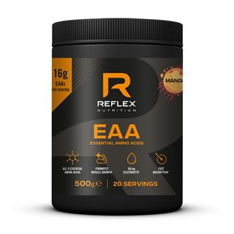 EAA Reflex Nutrition nabízejí 16 g EAA na jednu 25 g dávku! Jde tak o perfektní zdroj živin pro namáhané svaly, které po tréninku pro svůj růst a regeneraci potřebují esenciální aminokyseliny jako stavební látky. Komplex obohacuje hořčík a draslík (elektrolyty), které tělo během výkonu ztrácí a je tak třeba ja efektivně doplňovat. Vlastnosti hořčíku a draslíku souvisí s činností svalů. Podobné je to také s obsaženým vitamínem B6, jeho vlastnosti souvisí s energetickým metabolismem. Obsažený Bioperin® pomáhá ostatním složkat se vstřebáním.