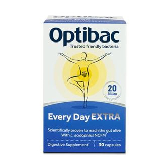 Optibac Every Day EXTRA je doplněk stravy s obsahem vysoké dávky komplexu vysoce kvalitních probiotik určeného pro každodenní podporu. Hodí se pro muže i ženy, lze jej užívat jako podporu obranného štítu, při vysoké zátěži, při rekonvalescenci, při užívání antibiotik nebo kdykoli, když citíme, že náš zažívací trakt potřebuje pomoci. Every Day EXTRA obsahuje celkem 4 druhy probiotických kultur z kmenů Lactobacillus acidophillus NCFM®, Lactobacillus paracasei Lpc-37®, Bifidobacterium lactis BI-07®, Bifidobacterium lactis BI-04® v zesílené dávce - celkem 20 miliard v 1 kapsli. Proto se hodí pro podporu např. při náročné rekonvalescenci, při velkých obtížích apod. U všech obsažených probiotik byla ověřena schopnost projít kyselým prostředím žaludku a dostat se až do střeva.