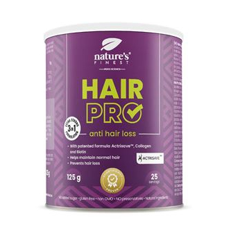 Hair Pro obsahuje patentovaný extrakt ActrisaveTM (černá rýže - Oryza sativa L., květy kaktusu opuncie - Opuntia ficus indica L.), který má příznivý vliv při vypadávání vlasů. Obsahuje látky s vlastnostmi souvisejícími s oxidativním stresem a vznikem nových vlasových cibulek. Hair Pro obsahuje také kvalitní kolagen typu 2 a D-biotin.