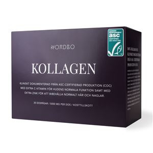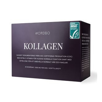 Nordbo Kollagen obsahuje hydrolyzovaný rybí kolagen Ecolovita® s kolagenovými peptidy typu I., přidaný vitamín C ve formě kyseliny L-askorbové a zinek ve formě L-askorbátu zinečnatého. Účinek obsaženého kolagenu Ecolovita® je zdokumentován klinickou studií, přidaný vitamín C a zinek zlepšují využitelnost kolagenu v těle - obě tyto látky jsou v organismu zapojené do jeho přirozené produkce. Nordbo Kollagen má jako jediný doplněk svého druhu na světě prestižní certifikaci ASC, která garantuje udržitelnost produkce a zároveň čerstvost rybí suroviny.