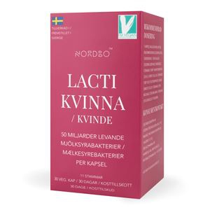 Nordbo Lacti Kvinna obsahuje 11 (!) druhů prospěšných biokultur zaměřených na podporu přirozeného prostředí intimní oblasti a bakteriální rovnováhy močových cest. Doplněk dále obsahuje prebiotikum a kysele neutrální vitamín C - ty napomáhají biokulturám účinkovat. Zažívací trakt a intimní oblast jsou propojené - při stresu, velké zátěži nebo špatném životním stylu může v zažívacím ústrojí nastat nerovnováha přirozeně se vyskytujících mikroorganismů (kmeny Lactobacillus). To může negativně ovlivnit pH v těle a následně mít nepříznivý vliv i na intimní oblast. Může dojít k různým problémům - suchosti, svědění, výtokům. Biokultury obsažené v Lacti Woman obnovují přirozenou mikroflóru a navrací tak tělu správné pH. Jde o kmeny, které v těle zpracovávají cukry a tvoří tzv mléčné kvašení. Kapsle (DRcaps®) jsou patentované a chrání obsah proti žaludeční kyselině, takže se bakterie mohou dostat až do střevního systému a na povrch všech sliznic, tedy na místo určení bez jakýchkoliv problémů a v plné síle!