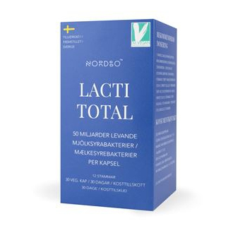 Nordbo Lacti Total obsahuje 50 miliard živých bakterií, zastoupených ve 12ti (!) kmenech, určených pro komplexní podporu zažívacího traktu. Při stresu, velké psychické nebo fyzické zátěži, vlivem špatného životního stylu, alkoholu, nebo antibiotik, může ve střevech dojít k nerovnováze přirozené mikroflóry. V takovém případě pak dochází k problémům v dalších oblastech. Přirozená mikroflóra v zažívacím ústrojí tvoří cca 80 % buněk imunitního systému v rámci našeho celého těla, proto je jejich optimální fungování velmi důležité. Kapsle (DRcaps®) jsou patentované a chrání obsah proti žaludeční kyselině, takže se bakterie mohou v kapsli dostat až do střevního systému, tedy na místo určení bez jakýchkoliv problémů a v plné síle!