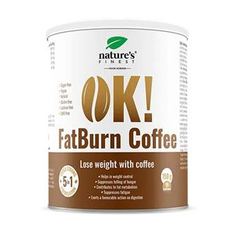 OK! Fat Burn Coffee je rýžový nápoj v prášku s přidaným kávovým extraktem, extraktem z guarany, L-karnitinem a extraktem z černého bezu. Je určený pro každodenní užívání během dne. Obsažené účinné látky mají podobné vlastnosti zaměřené na oblast kontroly hmotnosti, potlačení chuti na jídlo a dodání energie.