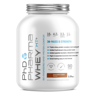 Pharma Whey HT+ je, inovovanou verzí řady PhD Pharma Whey - jednoho z nejprodávanějších proteinových přípravků na trhu.  Základ tvoří PhD Nutrition Hydro-Tech Plus Whey Protein Matrix, tedy proteinová směs, která je doplněna o kvalitní hydrolyzát syrovátkového izolátu Hydro-Tech +, který je zdrojem „rychlých“ aminokyselin.