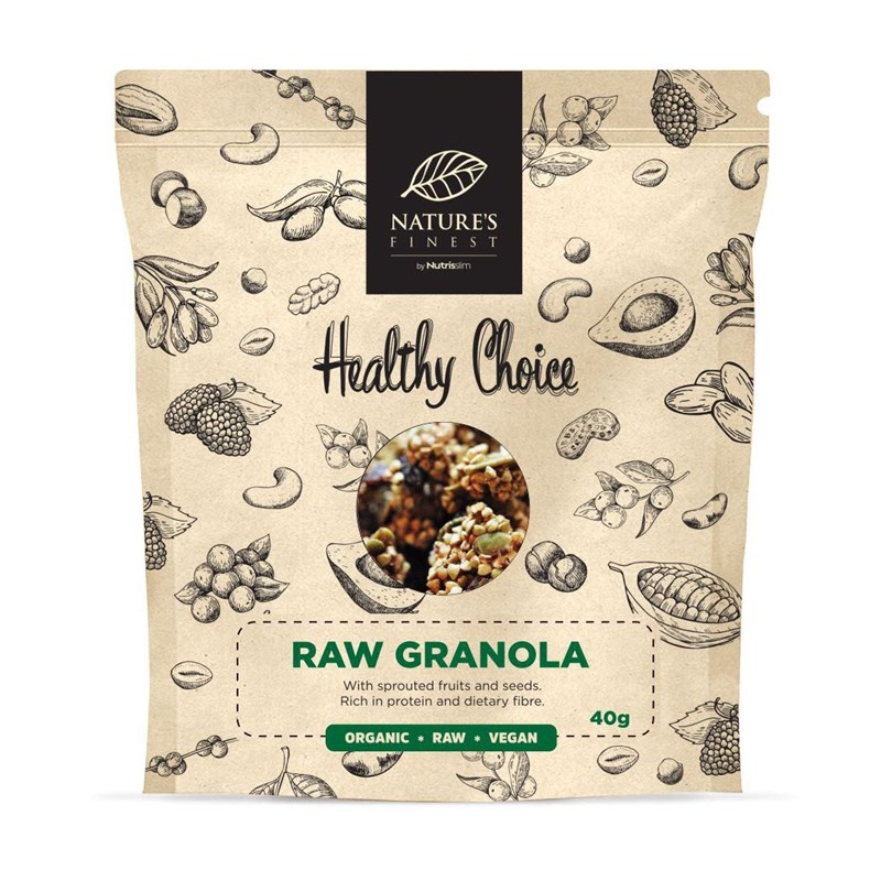Raw Granola je složená z naklíčených semínek a sušeného ovoce. Zamilují si ji všichni, kteří rádi mlsají, ale zároveň berou ohled na svoje tělo. Obsahuje lněné, sezamové a slunečnicové semínko, pohanku, fíky, meruňky a rozinky. Tato směs nejen, že výborně chutná, ale je také bohatá na vlákninu a celou řadu důležitých mikrountrientů.