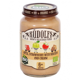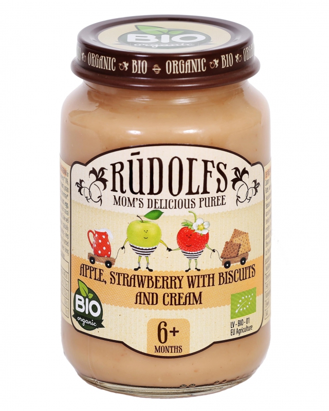 jablko*74%, jahoda*10%, sušenky*6% (pšeničná mouka, máslo, zakysaná smetana, bramborový strach), smetana*5%, agávový sirup*, voda. *- ekologické zemědělství.