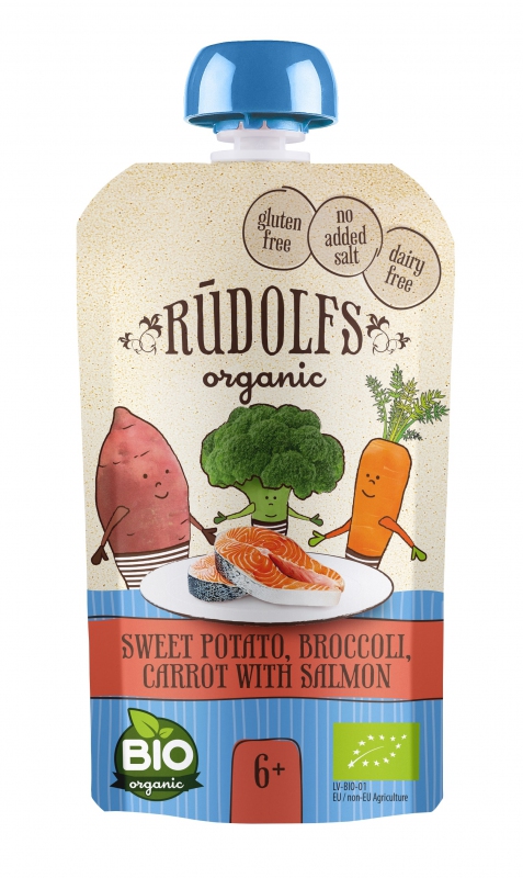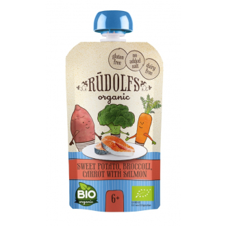 brambory*, voda, sladké brambory *20%, mrkev*18%, losos*8%, brokolice*4%, koncentrát citronové šťávy*, koření*.*- ekologické zemědělství.