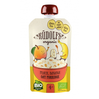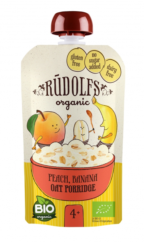 broskev* 32%, vařené celozrnné ovesné vločky bez lepku * 35% (voda, celozrnné ovesné vločky*), banán* 28%, voda. *- ekologické zemědělství.