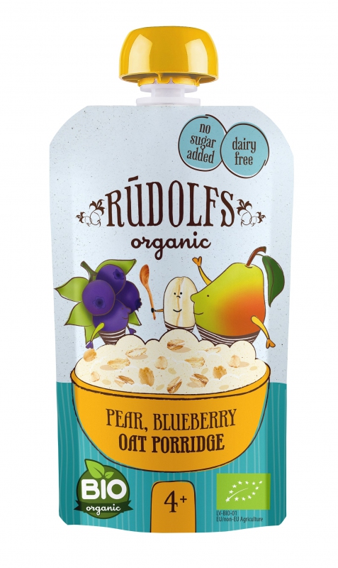 Hruška* 51%, vařené celozrnné ovesné vločky* 35% (voda, celozrnné ovesné vločky*), borůvky* 8%, hroznová šťáva*(z koncentrované šťávy). *- ekologické zemědělství.