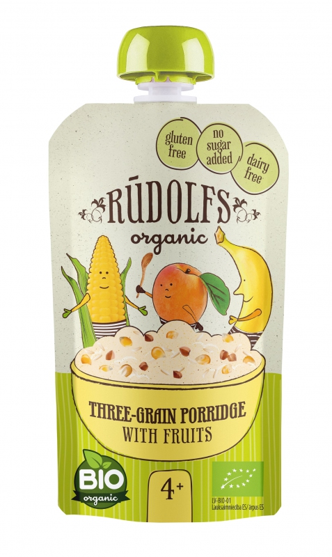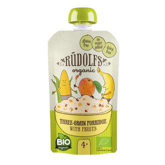 Bezlepková obilná 3zrnná kaše s ovocem pro zvláštní výživu kojenců a malých dětí od ukončeného 4. měsíce. Bez přidaných konzervantů. Bez přidaného cukru (obsahuje pouze přirozeně se vyskytující ovocné cukry).