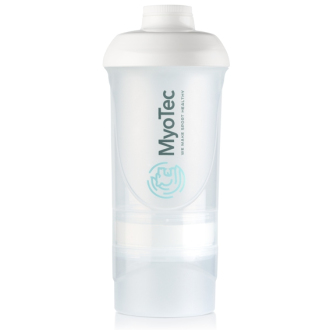 Velmi praktický šejkr MyoTec, se zásobníkem na prášek a kapsle.