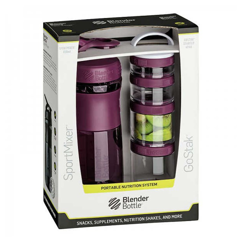 Obsahuje plastový šejkr 820 ml a plastový nosič. Šroubovací víčka zajišťují bezstarostné utěsnění. Praktický sportovní úchyt pro pohodlné nošení. BlenderBall® drátěná kulička napomáhá míchání obsahu při šejkování. GoStak® nosič se skládá ze 4 nádobek vhodných na svačinky s praktickým úchytem.