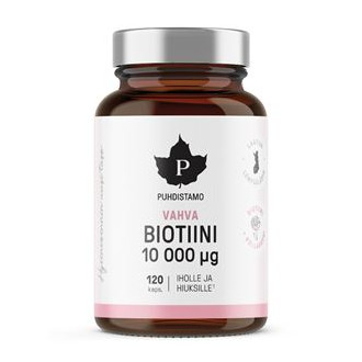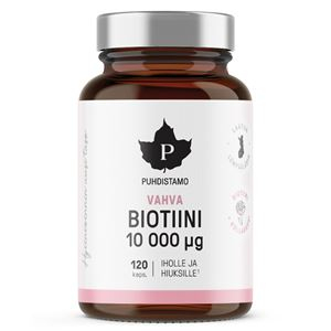 Strong Biotin Puhdistamo obsahuje 10 000 µg biotinu a hydrolyzovaný kolagenový peptid typu 1. Biotin je dobře známý svou schopností podporovat vzhled pokožky a vlasů. Pomáhá také udržovat normální funkci nervového systému a podporuje energetický metabolismus, čímž přispívá k vytrvalosti a bdělosti v každodenním životě. Tento produkt můžete používat samostatně jako součást své každodenní beauty rutiny – nebo jej kombinovat s dalšími produkty z řady Puhdistamo Beauty - Strong Hyaluronic Acid a Beauty Collagen.